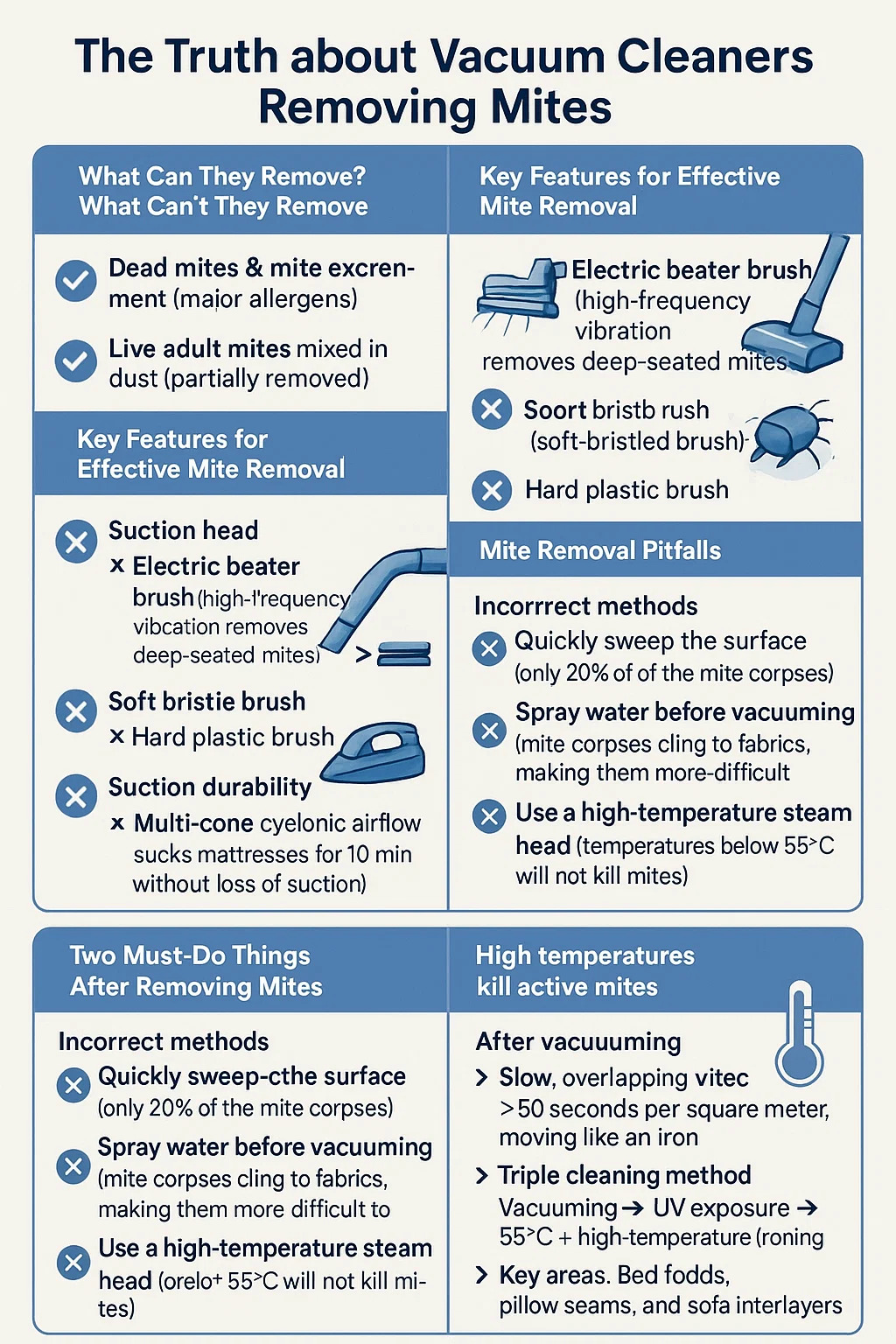 Juiste techniek: ► Langzaam, overlappend stofzuigen: ≥30 seconden per vierkante meter, bewegend als een strijkijzer ► Drievoudige reinigingsmethode: Stofzuigen → UV-blootstelling → strijken op hoge temperatuur van 55°C ► Belangrijke gebieden: Bedplooien, kussennaden en tussenlagen van banken (mijtennesten)